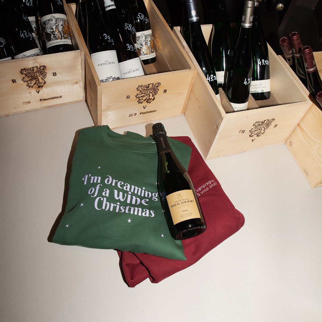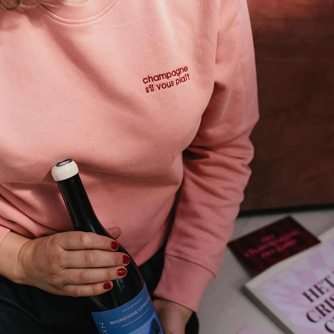 Champagne s’il vous plaît. Fair Trade, want voor minder doen we het niet. Een multi-inzetbare trui. Draag ‘m tijdens het studeren voor je wijnexamen of het kijken van Chef’s Table of Winemasters.tv, voldoet ook prima als lekkere trui voor mee op wijnreis.